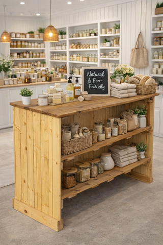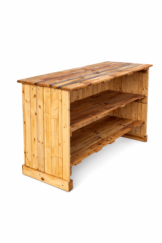 Mostrador de tienda con un diseño rústico y natural. Perfecto para exhibir productos. - Estructura principal de madera. - Estantes de madera. - Superficie de madera.