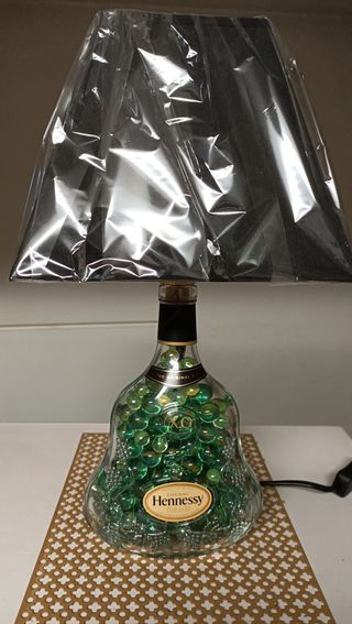 Lampara artesanal hecha a partir de una botella de Cognac Hennessy X.O. Con una elegante tulipa negra y canicas de cristal en su interior, que se ilumina al mismo tiempo que la tulipa. Ideal como decoración de casa rural, restaurante o regalo original. producto 100x100 artesano hecho con botella premium. Tengo más modelos en mi perfil . Objetos cotidianos qué nacen a partir del reciclaje, contribuimos con el medio ambiente. No vas a encontrar otra igual. Industrial ,antiguo flexo,trapo , coleccionistas, antigüedad, antigua,nuevo , iPhone,bicicleta, ordenador, móvil,reloj, coche, tablet, televisión,mueble, lampara,Ikea, vest