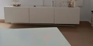Vendo mueble bajo para televisión de Ikea en color blanco. Diseño moderno y minimalista, muy funcional y con gran capacidad de almacenaje. El mueble es funcional y estable, pero como se muestra en algunas fotos, tiene algunos desperfectos estéticos debido al uso. Medidas: 150x55x35