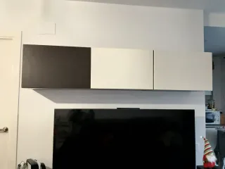 Mueble de TV BESTÅ de IKEA con puertas Hanviken. - Acabado en blanco. - Diseño moderno y funcional. - Medidas: 120x42x38 cm. - Puertas en color negro-marrón oscuro. - Cajón y puerta retráctil de fácil cerrado. - Detrás de mueble hay un par de agujeros muy pequeños de fácil ocultación (ver fotos).