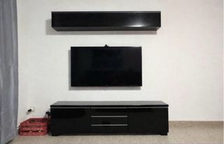 Mueble de televisión con un diseño moderno y funcional. - Acabado en color negro. - Fabricado en madera. Son dos módulos separados. Las medidas se incluyen en el dibujo de la foto.