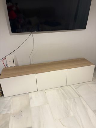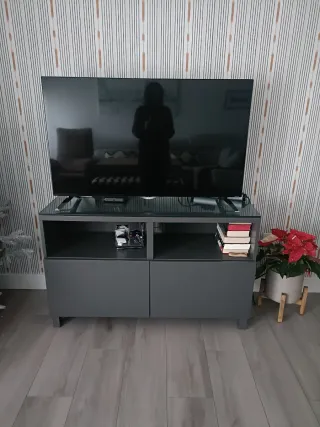 Mueble de televisión de Ikea de su colección BESTA. Tiene unas ruedas que le puse pero se le pueden quitar sin problema. - Acabado en madera oscura. - Dos compartimentos abiertos para dispositivos. - Ruedas para fácil movilidad Me urge venderlo lo antes posible! Por eso estoy dispuesta a negociar. A recoger en Triana