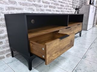 Mueble de televisión de madera con un diseño moderno y funcional. Cuenta con dos cajones y un espacio abierto. - Ruedas para fácil movilidad. - Tiradores metálicos en los cajones.