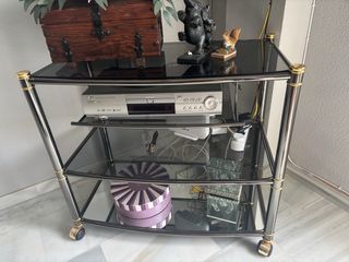 Mueble auxiliar en perfecto estado con estructura de metal y baldas de cristal. - Diseño moderno y elegante. - Acabado en dorado y negro. - Ideal para complementar tu salón o comedor.