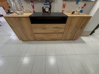 Mueble de televisión con un diseño moderno y funcional. Recogida en mano en Rafelbunyol - Acabado en madera clara. - Dos cajones centrales. - Compartimento abierto. - Laterales con puertas. Son 3 módulos diferentes. El central mide 160 de ancho y los laterales 40cm cada uno. Perfecto para casa de alquiler o estudiantes. Descuento si compras todo el pack de artículos del piso.