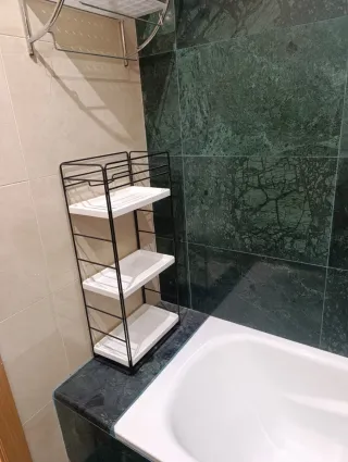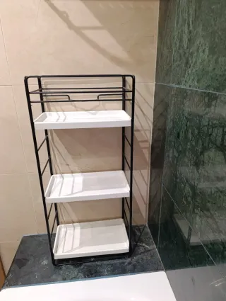 Práctico mueble auxiliar de baño con tres niveles se puede adaptar a distintas alturas. - Estructura metálica. - Bandejas de plástico.