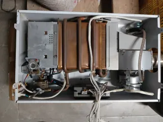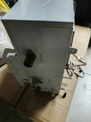 Calentador de gas para agua. -Falta el frontal. - No se si funciona o le falta algo más. - Componentes internos visibles. - Carcasa metálica.