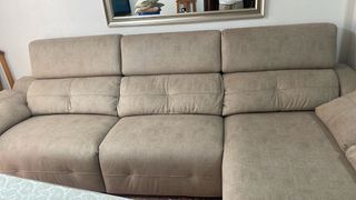 Sofá de 3 plazas con chaiselongue en muy buen estado. Su diseño moderno y cómodo lo hace ideal para cualquier salón. - Tapicería de tela. - Color beige neutro.