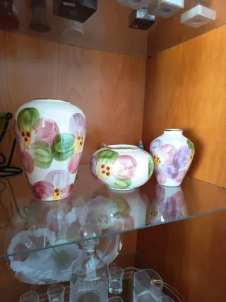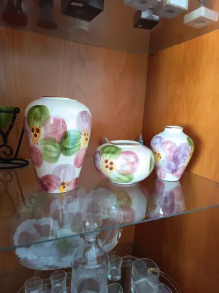 Conjunto de tres jarrones decorativos con un diseño floral pintado a mano. Añaden un toque de color y elegancia a cualquier espacio. - Jarrón grande con flores en tonos rosas y verdes. - Jarrón mediano con diseño floral. - Jarrón pequeño con flores en tonos morados y rosas.