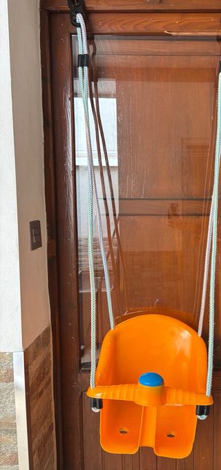 Columpio de plástico naranja para bebés y niños pequeños. Ideal para usar en interiores o exteriores. - Asiento ergonómico. - Barra de seguridad frontal. - Cuerdas resistentes.