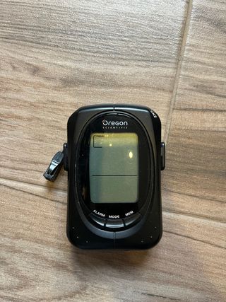 Estación meteorológica portátil de la marca Oregon Scientific. - Diseño compacto y moderno. - Pantalla digital. - Botones de control: ALARM, MODE, MEM. - Clip para sujeción.