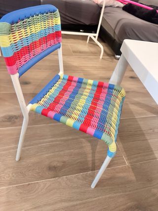 Conjunto de mesa y silla infantil de Ikea, perfecto para los más pequeños. El diseño es colorido y divertido. - Estructura de metal. - Asiento y respaldo de mimbre multicolor.