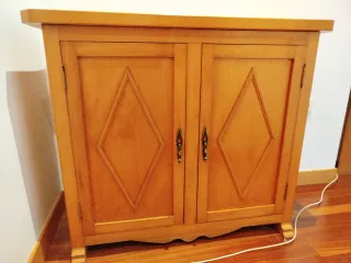 Aparador de madera con un diseño clásico y elegante. Ideal para dar un toque vintage a tu hogar. - Dos puertas con tiradores ornamentados. - Detalle de rombos tallados en las puertas. - Base con diseño curvo. -Color Madera claro.