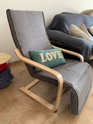 Cómodo sillón balancín con un diseño moderno y materiales de calidad. - Estructura de madera curvada. - Tapicería de tela en tonos grises. - Base mecedora para un suave balanceo.