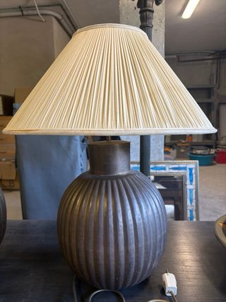 Elegante lámpara de mesa con un diseño vintage. - Base de latón con acabado dorado. - Pantalla de tela plisada en tono beige. Se venden juntas o por unidad . Juntas 130€. Por unidad : 60€ y 100 € con pantalla