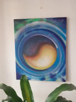 Cuadro decorativo con un diseño abstracto inspirado en el símbolo Yin Yang. Ideal para añadir un toque de color y armonía a cualquier espacio. Medidas 46× 54, es una pintura de un pintor reconocido venezolano,,, - Representación del Yin Yang. - Tonos azules y multicolor.