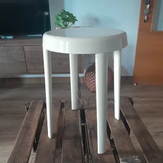 Mesa redonda de plástico con base negra. - Diseño moderno y funcional. - Ideal para espacios interiores o exteriores.