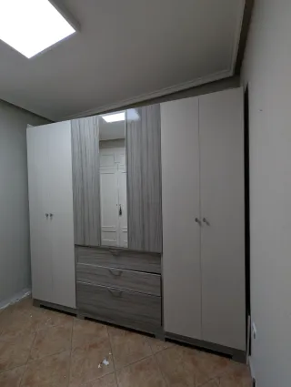 Armario de gran capacidad con un diseño moderno que combina paneles blancos y detalles en gris con veta de madera. Cuenta con un espejo central y cajones inferiores. - Paneles de madera con acabado mate. - Tiradores integrados en los cajones. - Espejo central de cuerpo entero. Los cajones estan un poco desencajados Tendrías que desmontarlo para llevártelo
