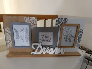 Marco de fotos con capacidad para tres imágenes, con un diseño inspirado en el estilo boho. - Acabado en madera y detalles decorativos. - Incluye un adorno de Dream en la base.