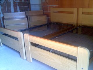 Conjunto de mobiliario para dormitorio compuesto por dos camas individuales y dos mesitas de noche. - Medidas de las camas: 200 x 100 cm. - Medidas de las mesitas: 60 cm de ancho. - Fabricado en madera.