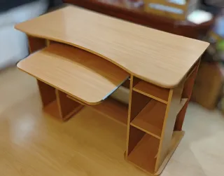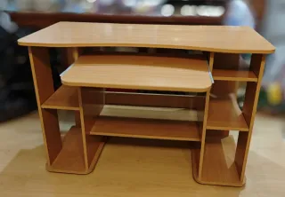 Mesa de escritorio funcional y elegante. - Diseño con estantes abiertos y cajones. - Acabado en madera natural. 1 metro de largo. 78 centímetros de alto . 42 centímetros de profundo