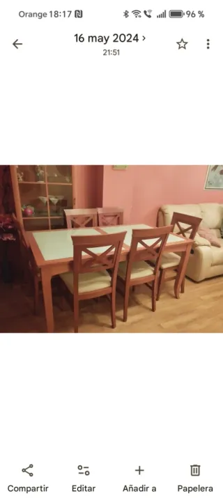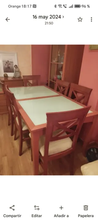 Mesa con 8 sillas tiene otra parte q va en l medio para hacerla extensible 1.60 x 90 cm y con la parte añadida 2m x 90 cm