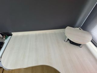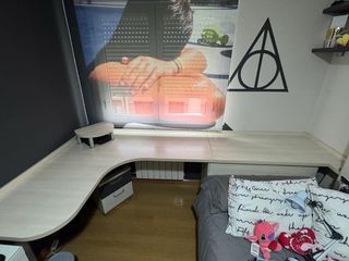Escritorio de madera con diseño a medida. - Acabado en tonos marrones y blancos. - Fabricado en madera. Se vende con la cajonera de abajo para almacenar objetos Se vende con el pie que hay encima del escritorio para apoyar tele o ordenador El estado del escritorio es muy bueno, siempre ha estado bien cuidado, se vende por querer cambiar la habitación.
