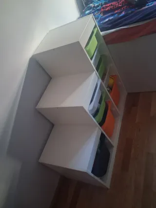 Mueble de almacenaje con varias cajas de colores. - Estructura blanca. - Cajas de plástico de diferentes tamaños y colores.
