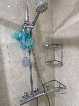 Conjunto de grifería para ducha con un diseño contemporáneo. - Incluye rociador superior y teleducha. - Dos estantes para accesorios de baño. - Mando termostático para control de temperatura.