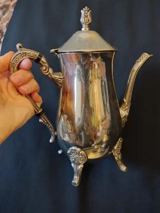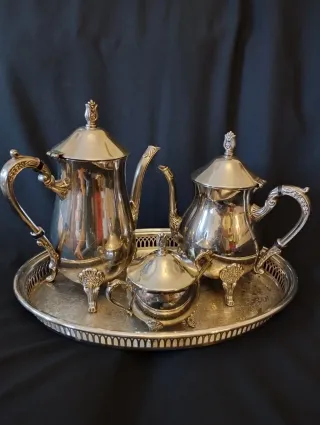 Elegante juego de jarras y bandeja plateadas. - Bandeja con detalles. - Jarra grande para café o té. - Jarra mediana para leche. - Azucarero con tapa. No sé de qué material son.