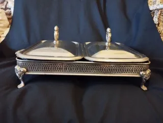 Elegante bufé con dos bandejas de cristal, perfecto para servir tus platos favoritos con estilo. - Base metálica plateada con detalles ornamentales. - Patas decorativas con diseño de animal. - Dos tapas a juego con asa.