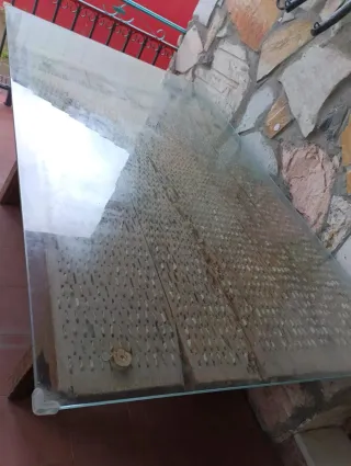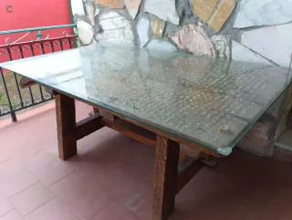 Mesa antigua de trillo, una pieza única con historia. - Estructura de madera robusta. - Superficie de cristal. - Diseño rústico y original.