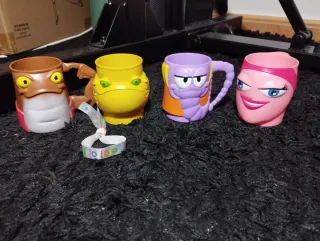 Conjunto de cuatro tazas coleccionables de Cola Cao con divertidos diseños de extraterrestres.