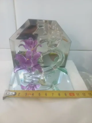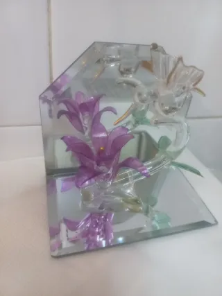 Preciosa figura decorativa de cristal con un diseño delicado. - Representa flores moradas y un colibrí. - Base y frontal de espejo. - Ideal para añadir un toque de elegancia a cualquier espacio. 10 centímetros de alto x 10 centímetros de largo