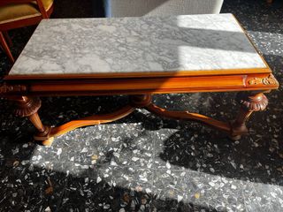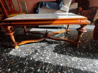 Elegante mesa baja para el salón con una preciosa tapa de mármol veteado y estructura de madera. - Tapa de mármol. - Diseño clásico con detalles tallados. - Base de madera robusta. No hago envios.
