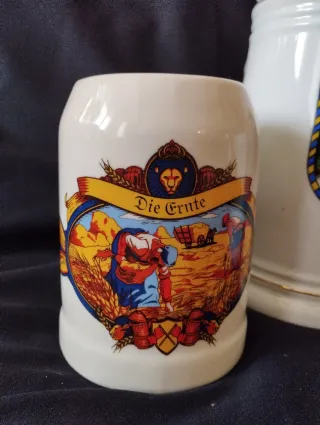 Conjunto de tres jarras de cerveza alemanas con diseños tradicionales. - 3 Jarras de cerámica con motivos de cervecería. - Diseños detallados y coloridos. - 2 de ellas son piezas decorativas con temática de la cosecha y la elaboración de la cerveza. - La grande representa un castillo y por detrás tiene un relieve de una escena cotidiana. Las medidas de alto están en las fotos. De regalo una taza lisa, marrón, también de cerámica. El precio es por las tres. Si solo quieres una, consulta por el chat.