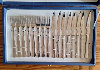 Elegante juego de cubiertos Dalper, ideal para ocasiones especiales. Se encuentra en su caja original. - Acero inoxidable 18/10 - Incluye 8 tenedores y 8 cuchillos de carne - Diseño clásico y atemporal.