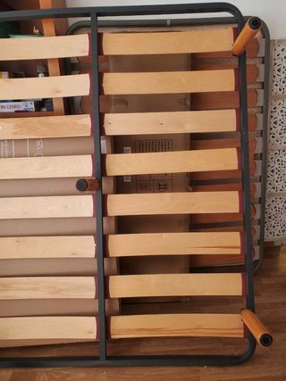 Somier de láminas de madera en buen estado. Las patas son de madera con una en la parte central que evita deformación. Una lámina está suelta y habría que fijarla. - Estructura metálica negra. - Láminas de madera de pino. - Patas de madera roble. - Medidas: 160x190cm