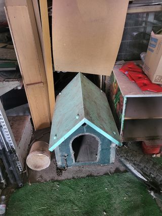 Caseta para perro de madera, ideal para perros pequeños. Tiene un diseño clásico de tejado a dos aguas. La caseta esta en buen estad9 solo es suciedad, pero a la hora de la venta estará limpia - Fabricada en madera. - Color verde y turquesa. - Diseño clásico de caseta.