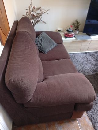 Se venden dos sofás de dos plazas cada uno. Son cómodos y de un bonito color marrón. - Tapicería de tela tipo pana fina - Diseño de dos plazas por sofá. - Como se puede observar en las fotos en una esquina de cada sofá tiene un parche marrón(levantado de tela por arañazos gato)y así lo tapamos. - También tiene alguna cremallera suelta. - Aún tienen mucha vida y son muy cómodos - el sofá más grande mide 190x90x 80 - el otro 160x90x80