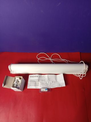 Nuevo Estor enrollable de la marca EASYFIX, modelo Noche y Día. Incluye instrucciones de instalación y accesorios. - Sistema de cadena para subir y bajar. - Incluye soportes para pared o techo. - Adhesivo 3M de espuma para montaje. - Medidas 45 x 220 cm. - Seguridad infantil.