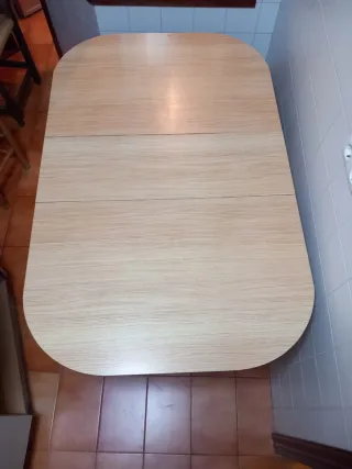 Mesa de cocina con un diseño práctico y funcional. Ideal para optimizar el espacio. Con dos sillas y dos taburetes. - Acabado en madera clara. - Extensible para mayor capacidad.