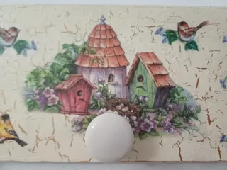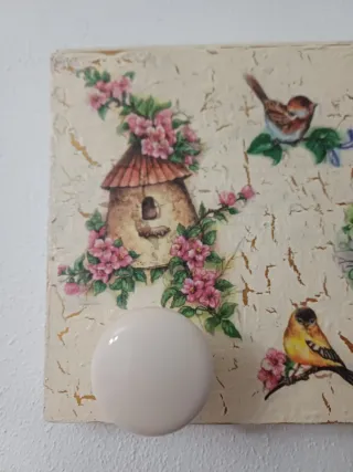Colgador decorativo con un diseño encantador de pájaros y flores, ideal para añadir un toque de color y naturaleza a tu hogar. - Base con acabado texturizado en tonos beige. - Detalle de pájaros y flores en la parte superior. - Incluye un colgador redondo de color blanco.
