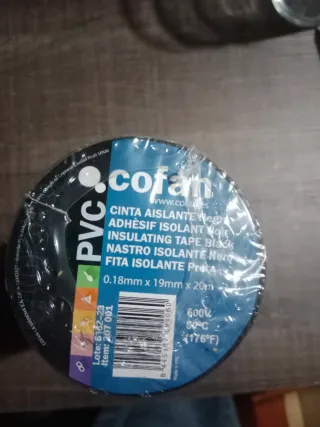 Rollo de cinta aislante de PVC de la marca Cofán. - Color: Negro - Medidas: 0.18mm x 19mm x 20m - Voltaje máximo: 600V - Temperatura máxima: 80°C (176°F) - Fabricado en PRC