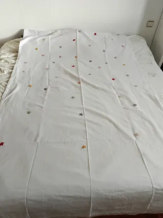 Cortinas blancas con un bonito estampado de estrellas en varios colores. Ideales para darle un toque divertido a la habitación de los más pequeños. - Diseño de estrellas multicolor. - Tejido de tela - algodón. Las cortinas son de Ikea, las estrellitas cosidas a mano. La altura de la cortina es de 242 cm, son dos cortinas de 135 de ancho cada una. Una tiene una pequeña mancha que si se quiere puede moverse una de las estrellas y quedará escondida.