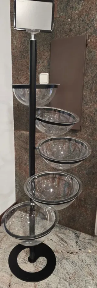 Muestrario expositor de 5 niveles con estructura metálica y cuencos semiesferas de metacrilato. - Diseño escalonado. - Cuencos transparentes. - Base y poste en color negro. Altura máxima 173cm. Diámetro cuencos 34cm y profundidad 16cm. Se pueden girar y desmontar los pocillos. Se puede quitar el cartel superior.