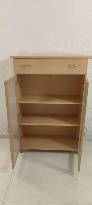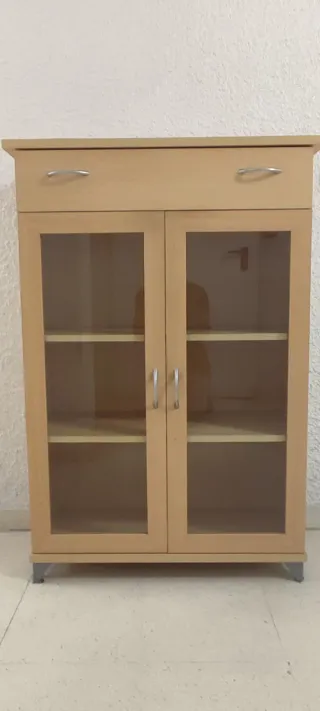 Mueble aparador con vitrina y cajón. El cajón tiene los rieles con un poco de holgura pero funciona bien. Posibilidad de llevarlo en furgoneta previo pago y recargo de 10 euros MEDIDAS: 135 ALTO X 85 ANCHO X 33 FONDO - Estructura principal de madera. - Puertas de cristal para exhibir tus objetos. - Tiradores metálicos. - Patas metálicas de soporte.