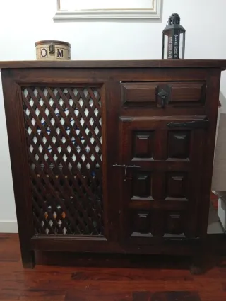 ( ESTE PRECIO SOLO ESTA SEMANA) Mueble de estilo Castellano, ideal para recibidores o salones en madera de Roble natural - Diseño rústico con detalles tallados. - Puerta con celosía y puerta con paneles. - Cajón superior con tirador de forja. - Bisagras y pestillo de forja. Negociable.