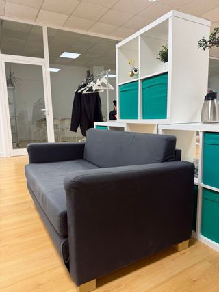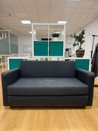 Sofá cama de Ikea con un diseño moderno y funcional. Es una pieza versátil que se adapta a diferentes espacios. - Ancho de 160 cm. - Tapizado en tela de color gris. - Ideal para dos personas. Funda comic incluida.