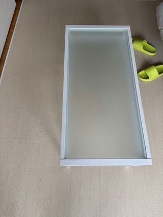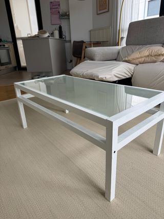 Elegante mesa de centro con sobre de cristal y estructura de madera . - Diseño moderno y minimalista. - Patas blancas que aportan luminosidad.